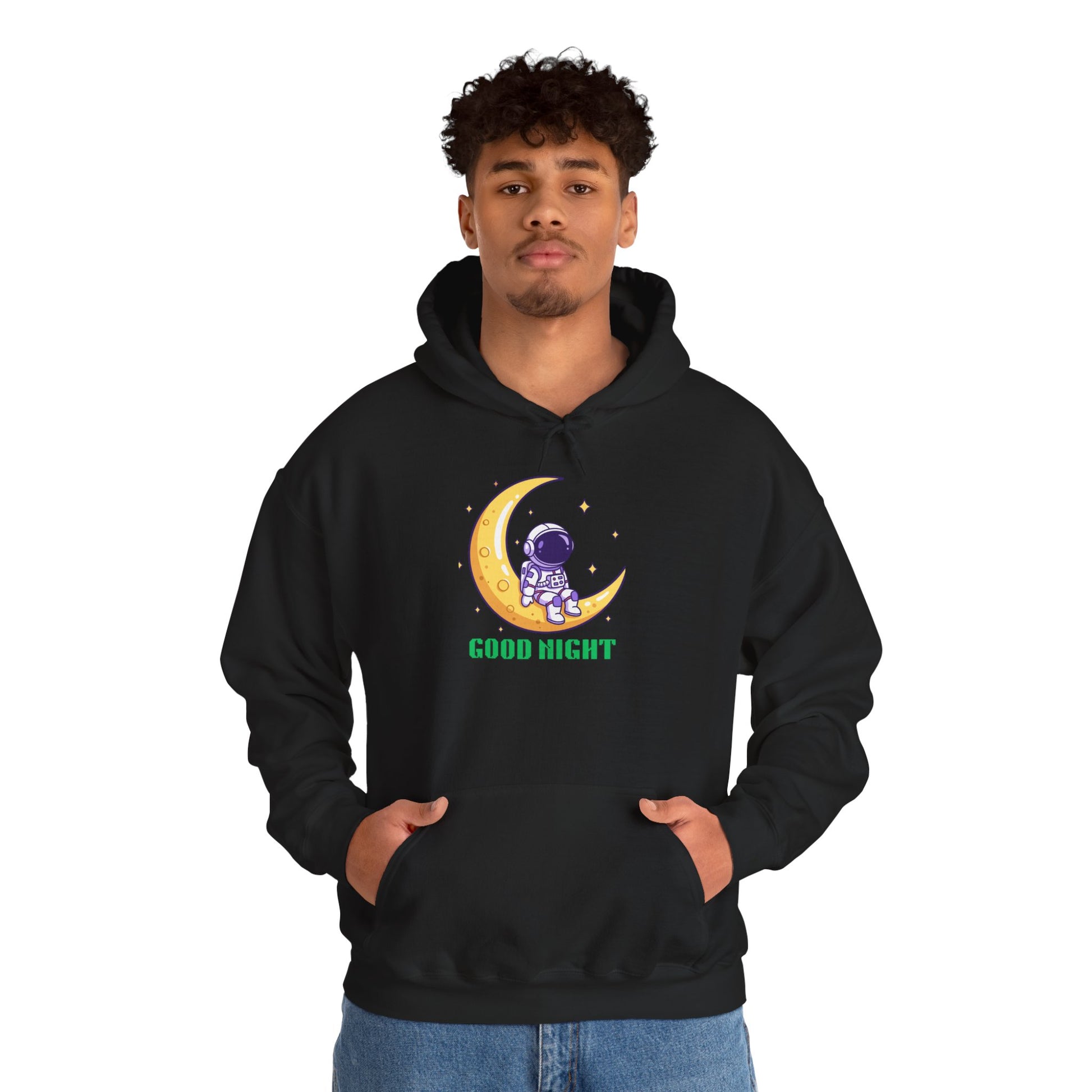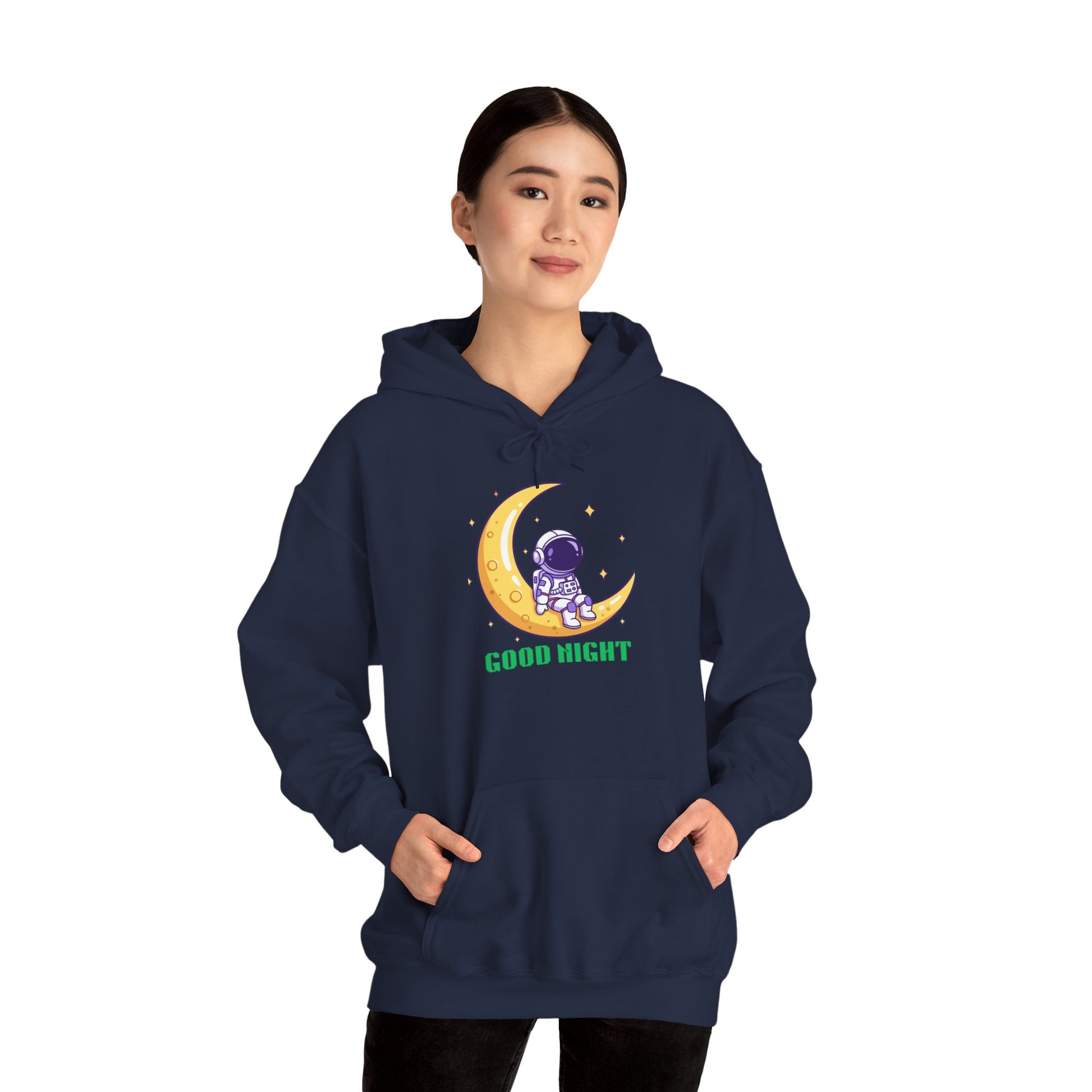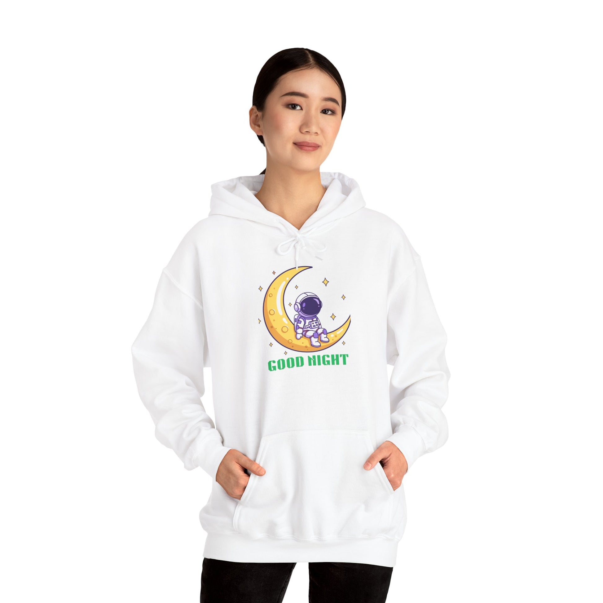 This cozy hoodie brings a quiet, star-lit moment to your everyday wardrobe. A small astronaut sits curled on a golden crescent moon, surrounded by soft sparkles, with the gentle phrase “GOOD NIGHT” beneath — a design that feels like a whispered bedtime story for grown-ups. Wear it on late-night walks, while reading by lamplight, or when you want a calm, whimsical layer for chilly evenings. The roomy kangaroo pocket and double-lined hood add warmth and comfort, while the smooth cotton-poly blend keeps the print crisp and the fabric soft against skin. Subtle enough to tuck into your daily rotation, yet expressive enough to start conversations with fellow stargazers.
