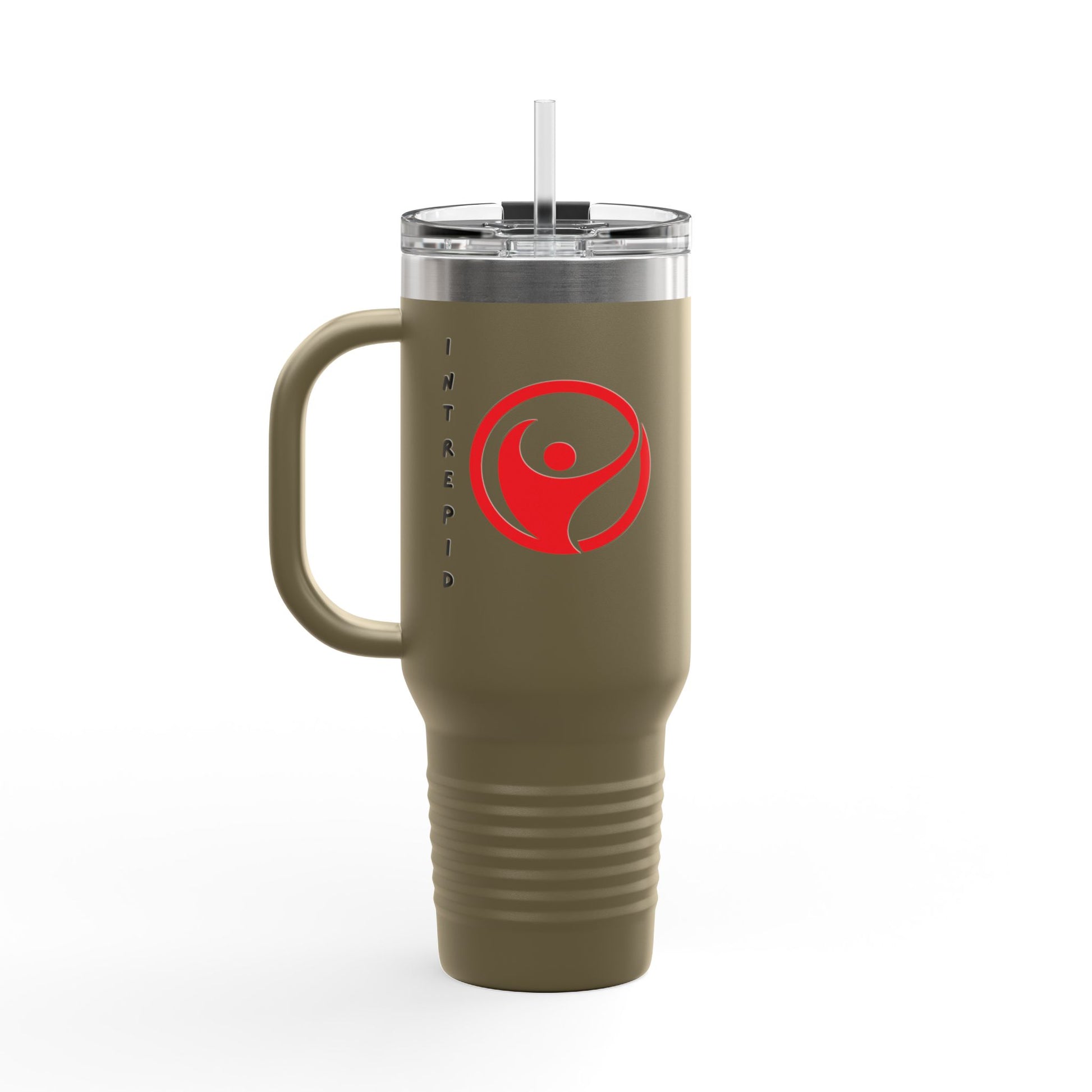 Intrepid- Fearless and adventurous- This 40oz insulated travel mug keeps your drinks right where you want them—hot on the morning commute, cold on long trail days. Built from durable stainless steel with double-wall construction and a powder-coated finish, it resists rust and feels solid in the hand. The ergonomic handle and included straw make sipping comfortable whether you’re driving, camping, or settling in at your desk. A leak-resistant push-on lid with a secure latch helps prevent spills while the large capacity carries plenty of coffee, iced tea, or water for hours. Available in multiple colors, BPA-free, and printed with UV-DTF for vibrant, lasting graphics, this tumbler is made to travel with you.